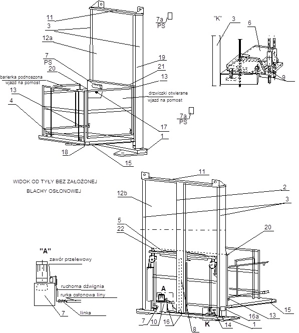 Wózki podnoszące umieszczone są wewnątrz kolumn i przemieszczają się w nich góra – dół za pomocą kół jezdnych po bieżniach w kolumnach. Podnoszone i opuszczane są za pomocą mechanizmu hydrauliczno – linowego. Pomost transportowy podnoszony jest poprzez zespół 4 lin / dwie nośne i dwie bezpieczeństwa/. Sterowanie - podnoszenie i opuszczanie zespołu wraz z pomostem załączane jest z kasety sterowniczej PS lub z kaset sterowniczych zewnętrznych.